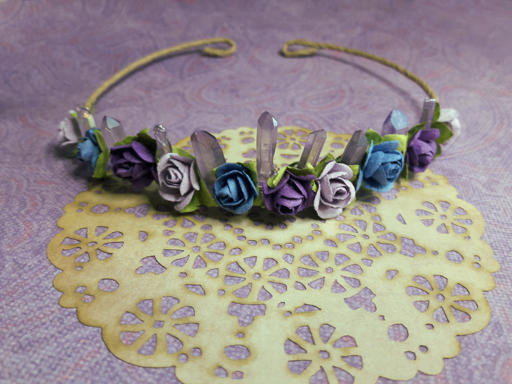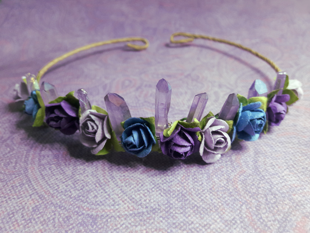 I have a childhood friend who turns 50 this month and I wanted to give her something special. I saw similar crowns for sale online but figured I’d try making one myself. I used amethyst points and paper roses.
